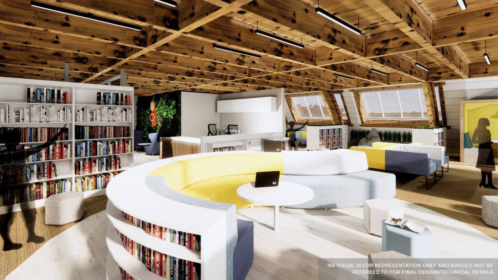 Natural light quickly emerged as one of the defining strengths of the space. The library’s elevated position and expansive windows provide exceptional daylight and views across the surrounding landscape. By opening sightlines and reorganising the interior layout, the design allows this natural light to flow more freely through the space, creating an environment that supports reading, concentration, and calm.
