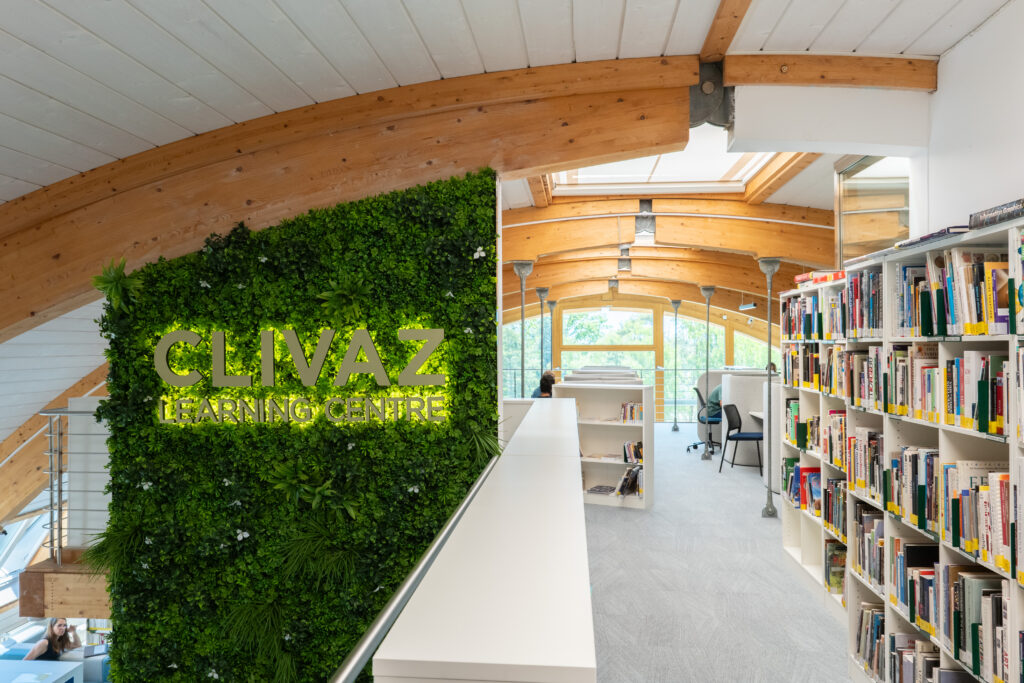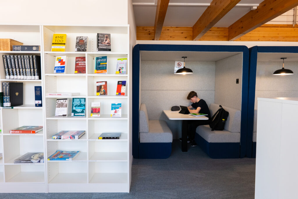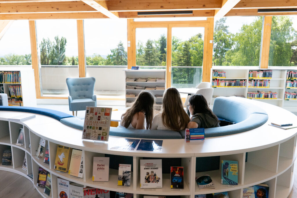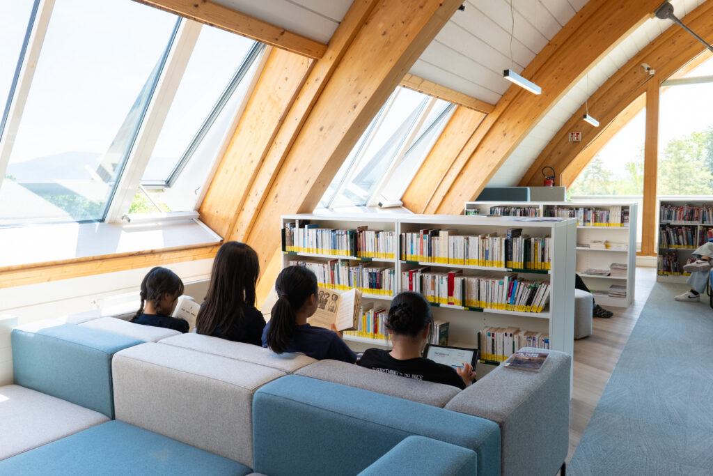 The result is a library that feels open, calm, and deeply connected to the everyday rhythm of life at Collège du Léman.